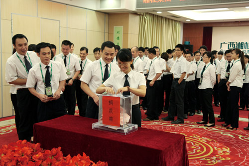 湘桂集團成立以來始終堅持熱心公益、樂善好施的優(yōu)良傳統(tǒng)。多年來,集團不僅成立了員工互助基金協(xié)會,堅持幫助困難員工及其家屬,還積極投身于社會扶貧、濟困、助學(xué)等各項慈善事業(yè),以實際行動履行社會責任。通過積極參加2012年南寧慈善日“能幫就幫·愛心滿綠城”的捐款活動,湘桂集團再次踐行“回饋社會、奉獻國家”的經(jīng)營宗旨,為加快構(gòu)建廣西“首善之區(qū)”、實現(xiàn)首府現(xiàn)代化建設(shè)新跨越做出自己應(yīng)有的貢獻。
