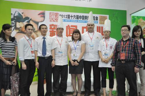 在廣州舉行的第十六屆中國烘焙會展覽會上,酵母公司工作人員與世界頂級烘焙師合影。