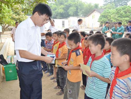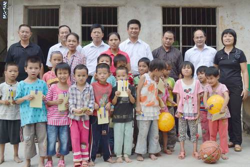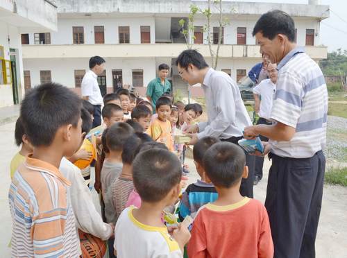 金和公司財務(wù)部經(jīng)理李華南為到耽小學(xué)學(xué)生分發(fā)學(xué)習(xí)用品。