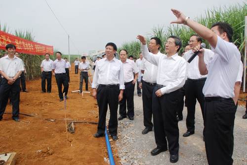郭聲琨充分肯定了湘桂公司孔香屯甘蔗種植示范基地建設所取得的良好成績。他指出,蔗糖產業是廣西的優勢產業、特色產業,崇左作為中國的糖都,地理環境優勢明顯。希望湘桂公司繼續創新發展方式,加強良種繁育,緊緊圍繞良種推廣、機械種植、水利增產的目標,延長糖業產業鏈,推動糖業經濟的發展。崇左市黨委、政府要下定決心,搞好農村土地流轉和農業規模化經營,通過發展規模化、機械化、集約化經營,解決甘蔗發展土地流轉問題;大力總結、推廣這種節水灌溉種植模式,加強科學管理,降低投入成本,依靠科學技術,解決甘蔗發展干旱難題、甘蔗發展單產和增產難題、進一步增加蔗農收入問題,做到農民滿意、社會滿意、企業滿意,做好做大崇左甜蜜事業,促進崇左經濟更好更快發展。