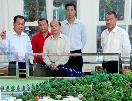 鄭世豐(中)一行聽取鄧豪(左一)關(guān)于湘桂·盛世名城建設(shè)情況匯報(bào)。