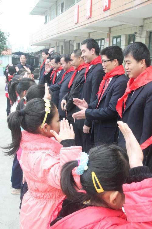 靈山縣三海小學小學生們為慰問組佩戴紅領巾并敬禮致謝。