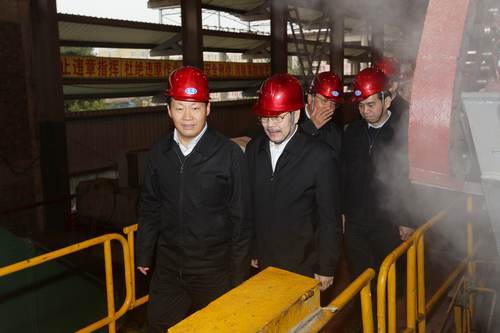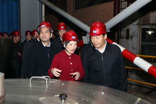 自治區(qū)黨委書記彭清華(前右)聽取湘桂集團副總裁刁曉(前左)介紹制煉車間運轉(zhuǎn)情況。