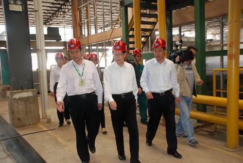 自治區(qū)黨委副書記危朝安(前左二)視察崇左湘桂公司制煉車間。