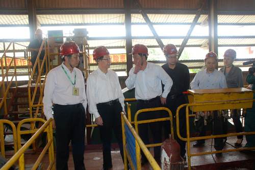 自治區(qū)黨委副書記危朝安(左二)聽取湘桂集團(tuán)董事局副主席陳輝(左三)介紹壓榨車間運(yùn)轉(zhuǎn)情況。