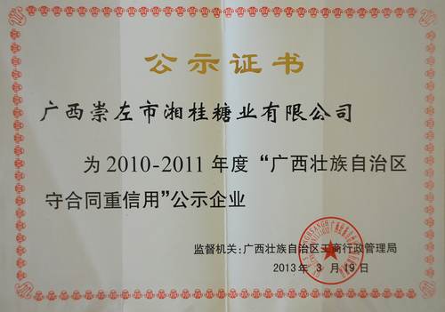 近日獲悉,湘桂集團下屬子公司廣西崇左市湘桂糖業有限公司(簡稱崇左湘桂公司)獲自治區工商局授予2010-2011年度廣西壯族自治區“守合同重信用”企業榮譽稱號。