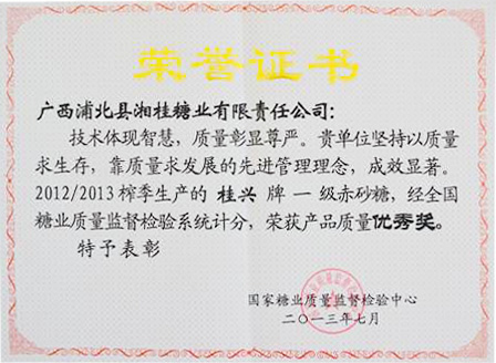 近日獲悉,湘桂集團下屬子公司廣西浦北縣湘桂糖業有限責任公司(簡稱浦北湘桂公司)2012/2013榨季生產的“桂興”牌一級赤砂糖榮獲國家糖業質量監督檢驗中心頒發的“產品質量優秀獎”。