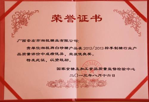 近日獲悉,湘桂集團下屬子公司廣西崇左市湘桂糖業有限公司(簡稱崇左湘桂公司)產品“湘桂”牌一級白砂糖榮獲國家食糖及加工食品質量監督檢驗中心頒發的“2012/2013榨季制糖行業產品質量優良獎”。