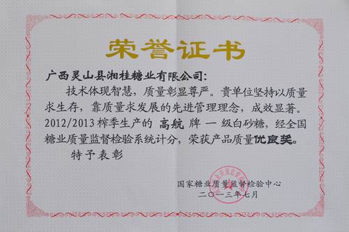 近日獲悉,湘桂集團下屬子公司廣西靈山縣湘桂糖業有限公司(簡稱靈山湘桂公司)2012/2013榨季生產的“高航牌”一級白砂糖經全國糖業質量監督檢驗系統計分,榮獲國家糖業質量監督檢驗中心頒發的“產品質量優良獎”。