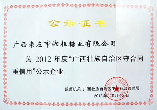 近日獲悉,湘桂集團下屬子公司廣西崇左市湘桂糖業(yè)有限公司(簡稱崇左湘桂公司)獲自治區(qū)工商局授予2012年度“廣西壯族自治區(qū)守合同重信用”企業(yè)稱號。