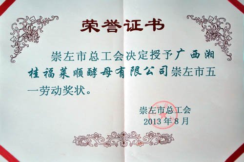 湘桂福萊順酵母公司獲崇左市“五一勞動(dòng)獎(jiǎng)狀”榮譽(yù)