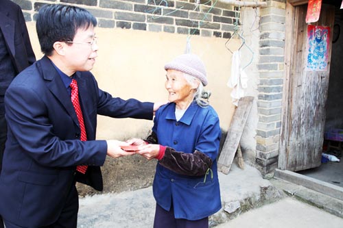 湘桂房地產公司監事會監事長張守輝為孤寡老人送上慰問金。