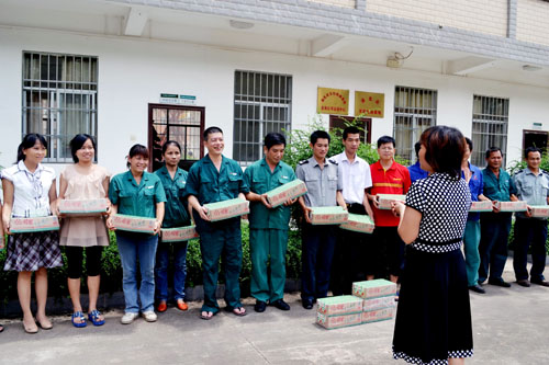 浦北縣總工會副主席許敏(左一)為員工發放清涼飲料。