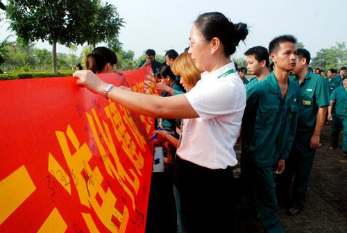 圖為員工在宣傳橫幅上簽字。