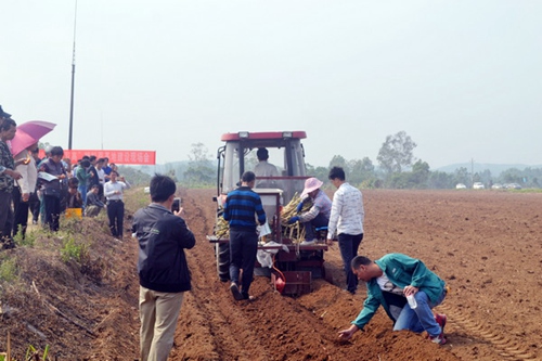 現場會上,浦北湘桂公司總經理助理、農務部經理梁明場向與會人員介紹位于石埇鎮八東渡267畝“雙高”糖料蔗基地建設情況及公司對建設“雙高”糖料蔗基地的扶持措施及優惠政策,同時還詳細地介紹了甘蔗種植機的性能和安排機手進行種植演示。甘蔗種植機一次性完成開行、切種、擺種、回土、施肥放藥、蓋膜等種植甘蔗全過程贏得了與會人員的贊嘆。