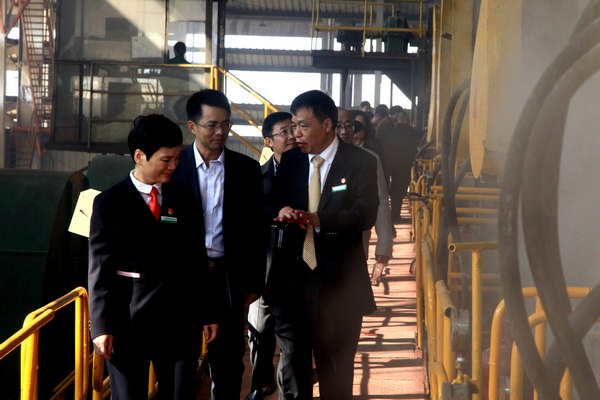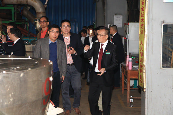 湘桂集團(tuán)董事,湘桂華糖董事長(zhǎng)、總裁謝華誠(chéng)陪同嘉賓參觀生產(chǎn)車間。