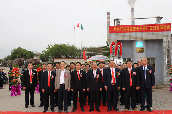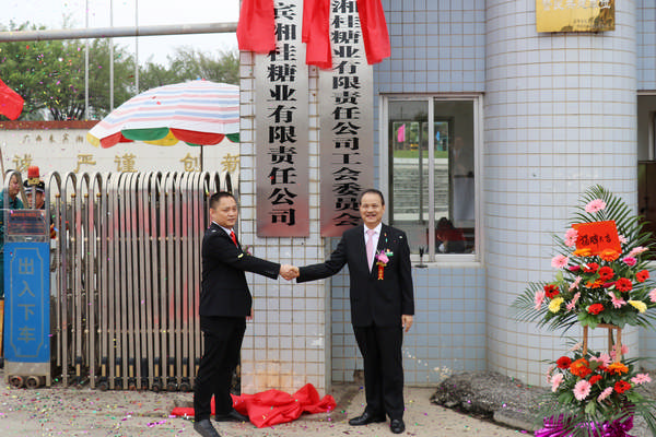 儀式上,勞建銘與吳輝共同為“廣西來賓湘桂糖業(yè)有限責任公司”和“廣西來賓湘桂糖業(yè)有限責任公司工會委員會”牌匾揭幕,參加儀式的全體人員見證了這歷史的時刻。
