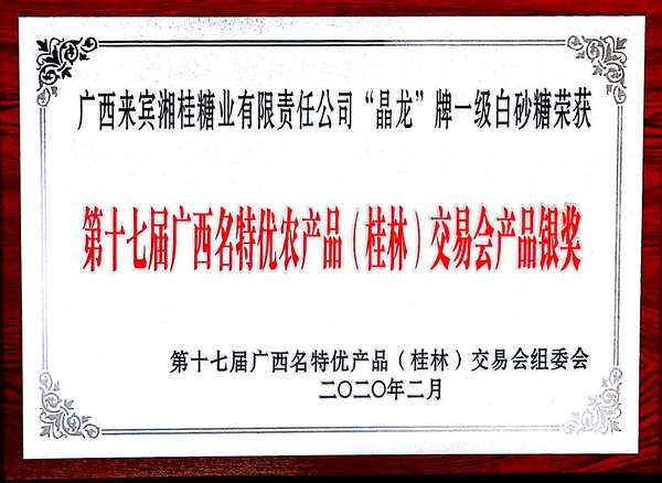 來賓湘桂公司“晶龍”牌一級白砂糖榮獲第十七屆廣西名特優(yōu)農(nóng)產(chǎn)品交易會銀獎