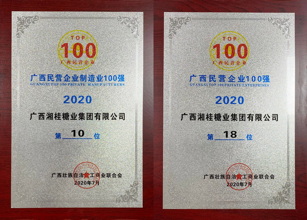 7月31日,廣西壯族自治區(qū)工商業(yè)聯(lián)合會主辦的“2020廣西民營企業(yè)100強”發(fā)布會在南寧舉行,廣西湘桂糖業(yè)集團有限公司榮獲“2020廣西民營企業(yè)100強”、“2020廣西民營企業(yè)制造業(yè)100強” 榮譽。