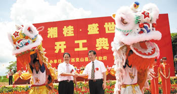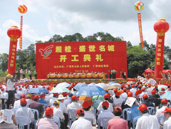 2007年6月25日,廣西靈山縣城中心鳴珂江畔、雙鶴公園旁的竹山園小區(qū)彩旗飄飄,汽球高掛,龍獅群舞,鼓樂齊鳴,熱鬧非凡,由湘桂集團投資建設(shè)的湘桂·盛世名城大型樓盤隆重開工。自治區(qū)農(nóng)業(yè)廳廳長張明沛,自治區(qū)人民政府駐廣州辦事處主任張敢,欽州市委常委、宣傳部長、副市長白志繁。欽州市人大常委會副主任陳麗麗、鄭世豐,欽州市政協(xié)副主席陳斯俊。桂林市人大常委會副主任韋廣雄。來賓市政協(xié)副主席黃桂廷。崇左市政協(xié)副主席黃炳春。靈山縣委書記李躍飛、縣長潘雪紅、縣人大常委會主任黃羽萍、縣政協(xié)主席龐治等四家班子領(lǐng)導(dǎo),浦北縣四家班子領(lǐng)導(dǎo),欽州市各管理區(qū)主要領(lǐng)導(dǎo),靈山縣直各單位、各鎮(zhèn)主要領(lǐng)導(dǎo),崇左市江州區(qū)等縣區(qū)的黨政領(lǐng)導(dǎo);廣西各大銀行系統(tǒng)的領(lǐng)導(dǎo);區(qū)內(nèi)外相關(guān)新聞媒體的記者;湘桂集團董事局主席勞建銘,董事局副主席陳輝、黃建軍,董事蒙子函、陳質(zhì)棠、潘曙光,董事助理鄧豪、李明偉、黃盛新,監(jiān)事會主席陳昭遠(yuǎn),監(jiān)事刁曉、黃春梅等湘桂集團代表;以上人員共500多人參加了開工典禮。開工典禮由靈山縣縣長潘雪紅主持。