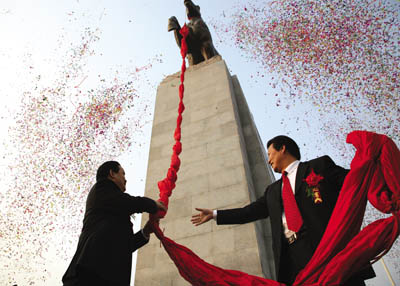 李躍飛、潘雪紅、黃羽萍、龐治等靈山縣四家班子領導,中國著名雕塑大師曹崇恩,湘桂集團董事局主席勞建銘、副主席陳輝、黃建軍,董事蒙子函、陳質堂、潘曙光等出席落成儀式。揭幕儀式由縣長潘雪紅主持。集團董事局副主席陳輝在儀式上致詞,希望“駿馬”能成為靈山縣城標志性象征,能夠為靈山人民帶來幸福美好的福祉,能夠為外來的投資者帶來事業興旺和滾滾財源,能夠使靈山在構建社會主義和諧社會的偉大事業中,象一匹奔騰的駿馬,縱橫馳騁,策馬奔騰!