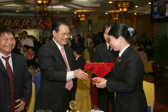 集團(tuán)董事局主席、總裁勞建銘(中)給員工拜年。
