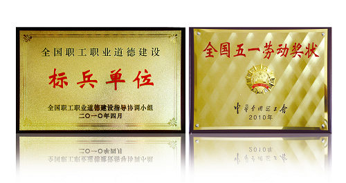 圖為被授予的全國職工職業(yè)道德建設(shè)標(biāo)兵單位牌匾及全國五一勞動獎狀