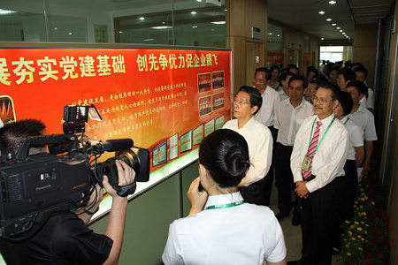 圖為郭聲琨書記在集團黨委書記、總裁勞建銘陪同下參觀集團開展創先爭優活動板報