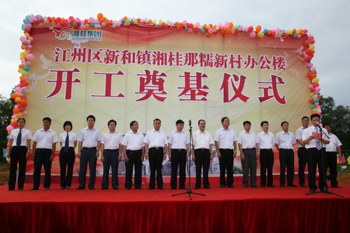 10月15日,位于崇左市江州區新和鎮的那糯村,鞭炮聲聲,喜慶連連,由湘桂集團全資贊助興建的那糯新村辦公樓正式奠基開工。江州區委書記藍大煌、區長秦昆、人大常委會主任李志林、政協主席何斌等江州區領導,集團董事局主席、總裁勞建銘,集團董事、副總裁鄧豪,集團副總裁刁曉等集團領導出席開工儀式。