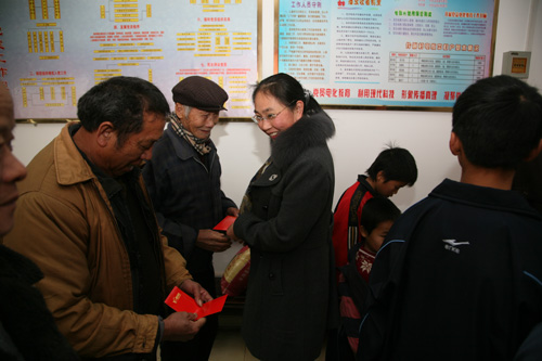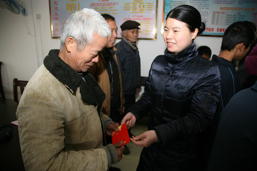 預備黨員、集團人力資源部副經理徐瑞芬(右)為老人送上慰問金并致以新春祝福。
