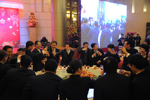集團董事、副總裁勞創(chuàng)禹(右3)、集團副總裁刁曉(右2)向員工敬酒并致以新春祝福。