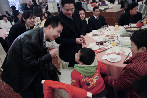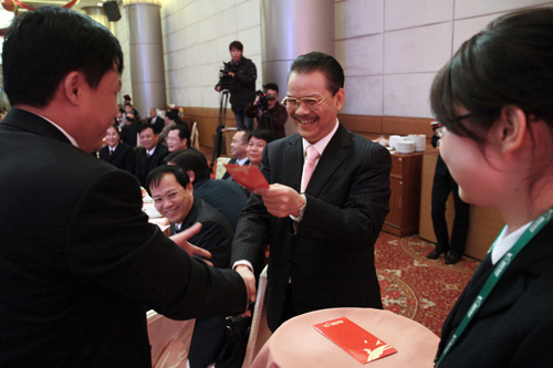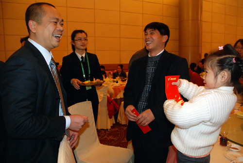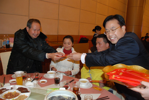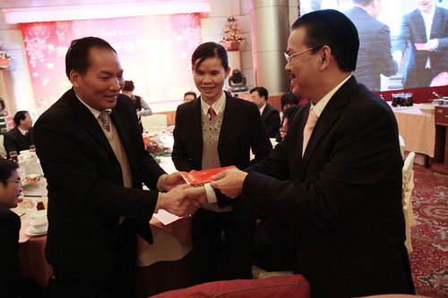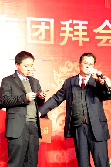 集團董事局主席、總裁勞建銘在團拜會上發(fā)紅包。