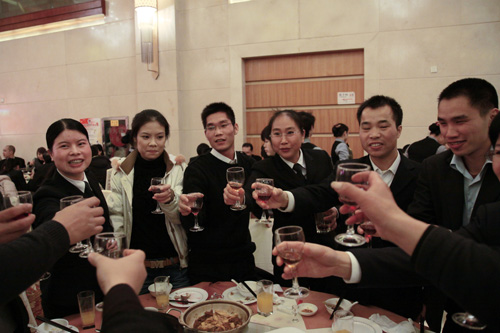 集團總裁助理黃春梅(右3)、集團人力資源部副經(jīng)理徐瑞芬(左1)向員工敬酒并致以新春祝福。