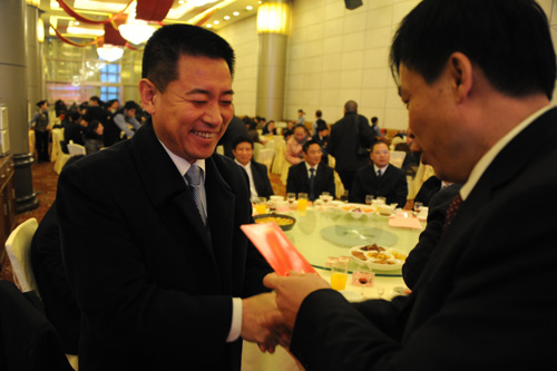 房地產(chǎn)公司副總經(jīng)理李寶忠(左)接過集團領導送上的紅包,互致新春祝福。