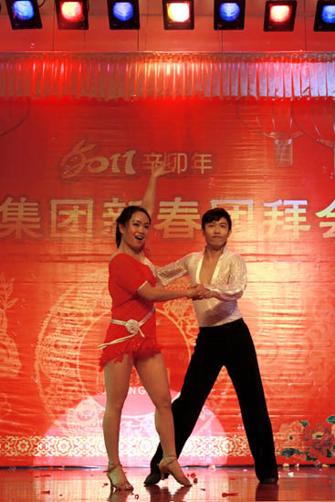 金和公司總經(jīng)理羅成武(右3)等公司領導在晚會上表演節(jié)目。