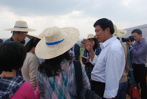 湘桂公司常務副總經理莫江(左一)為中央媒體采訪團介紹示范基地情況。