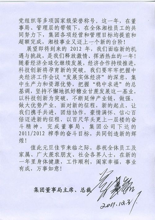 來源:廣西湘桂集團/廣西湘桂糖業(yè)集團/廣西湘桂糖業(yè)公司 發(fā)布日期:2011-12-31 17:26:11