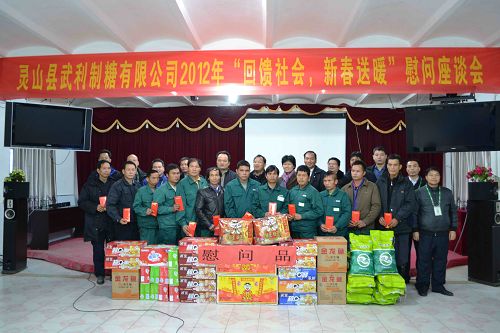 1月5日,集團監事會主席、副總裁蒙子函,武利公司總經理滕家偉帶領武利公司慰問組到欽州市靈山縣武利、伯勞、文利等鄉鎮蔗區開展“回饋社會,新春送曖”迎新春送溫暖活動,對武利公司的困難職工及當地五保戶、孤寡老人、孤兒、困難蔗農等進行親切慰問。