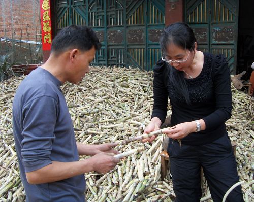 集團總裁助理黃春梅(右)指導蔗農砍種選種。