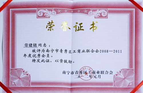 近日,湘桂集團以優異的綜合業績榮獲“南寧市青秀區工商聯合會2008-2011年度優秀企業”,集團總裁勞建銘被評為“南寧市青秀區工商聯合會2008-2011年度優秀會員”。