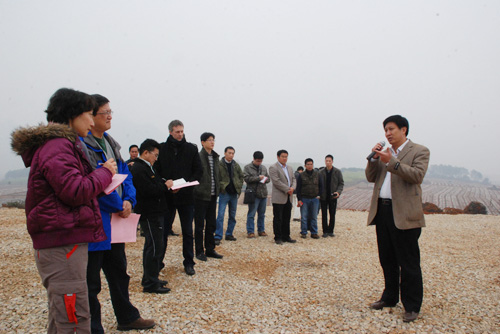 莫江向聯合國開發計劃署駐華代表處處長戈門(前排左四),可口可樂公司大中華區總監田文紅(前排左一)等領導匯報項目建設情況。
