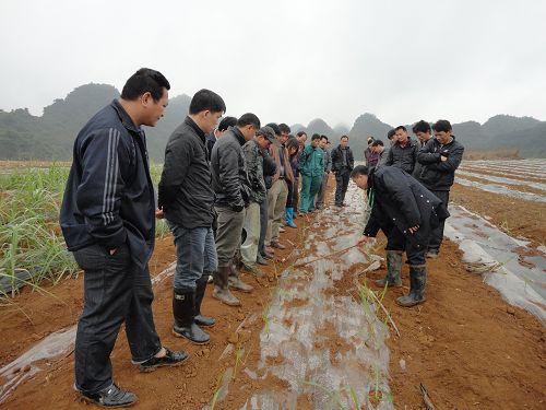 湘桂公司副總經理譚深真重點介紹了宿根蔗管護過程中的破壟松蔸、地膜覆蓋技術操作方法,并對不同含量的“湘桂牌”生態肥的使用方法進行指導。譚深真表示,湘桂公司一方面不斷加大對甘蔗種植管理的扶持力度,另一方面加強對蔗農掌握和應用甘蔗科學種植管理技術的指導,己所能及地幫助蔗農實現增產增收,希望通過種蔗大戶的示范作用,以點帶面,在蔗區內掀起科學種蔗、科學管理的熱潮。